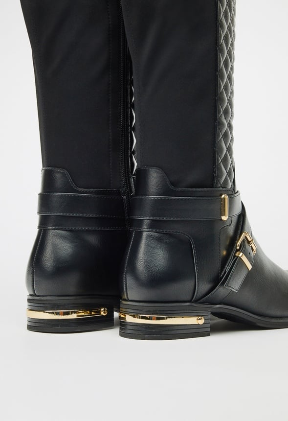 An over-the-knee flat boot featuring a quilted front panel, stretchy neoprene back, buckle detail, and metal rand on the heel. Material : Faux Leather Outside Heel Height : 1.25 Closure : Functional Inside Zipper Shaft Height : 18.25 Imported