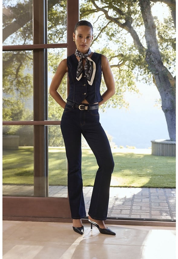 Mini flare Material : 99% Cotton, 1% Spandex Approx. Front Rise : 12.25 Approx. Inseam : 31.5 Approx. Leg Opening : 20.0 Pockets : 5 Pocket design Fabrication : Dark Wash Closure : Zipper button front closure Care : Machine wash. Please refer to care instruction label inside garment for further details. Imported