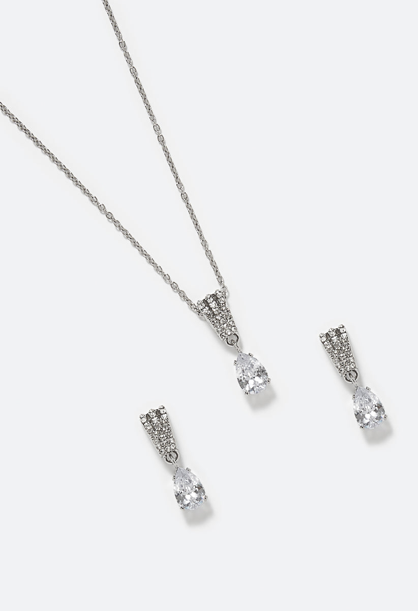 Perfect Day Or Night ,Liz Glass Stone Teardrop Earring And Pendant Necklace Set Adds A Classic Twist Material : 45%ZINC40%CZ10%GLASS5%STEEL Dimensions : Necklace: Length 16.5 Extender chain: 3 Worn neck 16.5 ~19.5 Earring: Length 1.0 Closure : Lobster clasp/Bullet stoppers/Rubber stoppers Imported