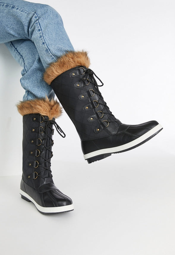 A flat cold weather boot featuring a faux-fur cuff and lace-up closure. Material : Faux-Leather Platform Height : 0.75 Outside Heel Height : 1.5 Closure : Adjustable Laces Shaft Height : 10.75 Imported