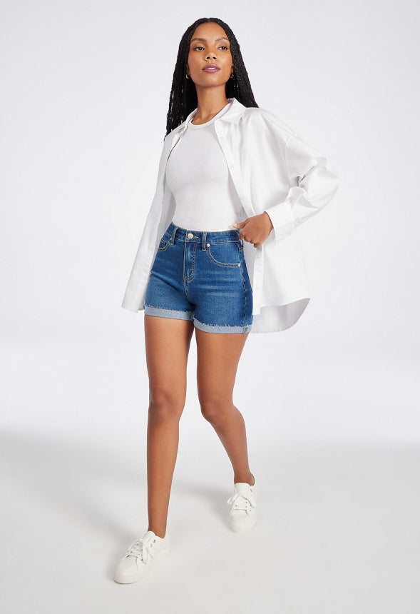 Material : 73% Cotton, 23% Polyester, 35 Rayon, 1% Spandex Fabrication : Medium Wash Approx. Front Rise : 11.75 Approx. Leg Opening : 22 Approx. Inseam : 3.25 Imported
