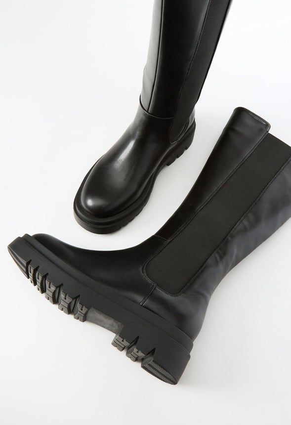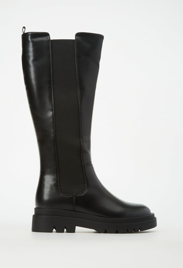 A flat boot with a lug sole and zip closure. Material : Faux-Leather Platform Height : 1.75 Outside Heel Height : 2 Shaft Height : 14.75 Imported