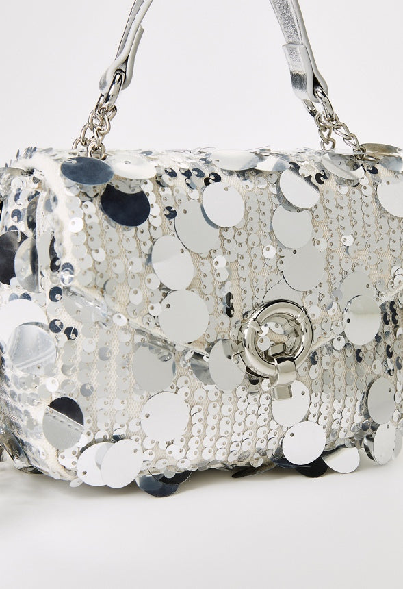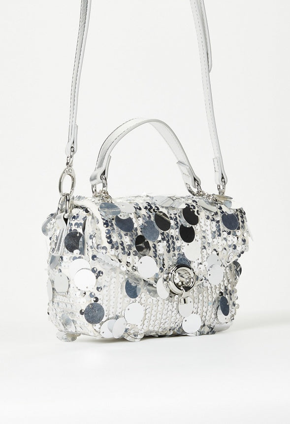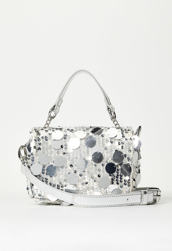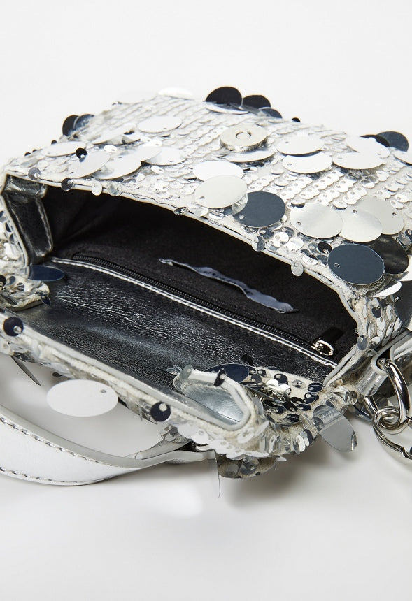 Material : Sequin Dimensions : 6.69 L x 2.36 W x 4.72 H Drop : 20.87 Pockets : 1 interior pocket, 1 interior zip Closure : Snap Hardware : Silver Imported