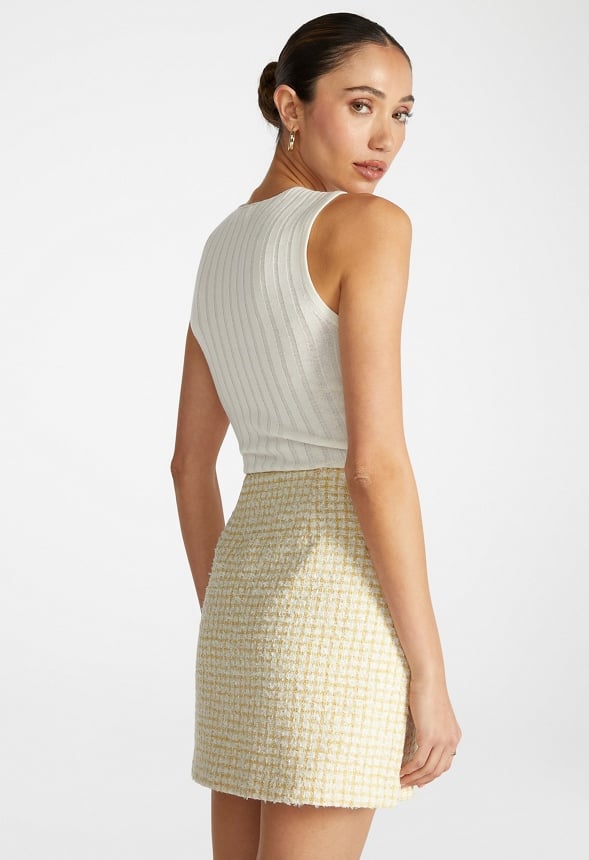 Lined Side zipper Material : Body: 75% Polyester, 15% Arcylic, 5% Viscose, 3% Nylon, 2% Cotton, Lining: 97% Polyester, 3% Elastane Length : 16.0 Pockets : Faux pockets with faux button front closure Care : Machine wash. Please refer to care instruction label inside garment for further details. Imported