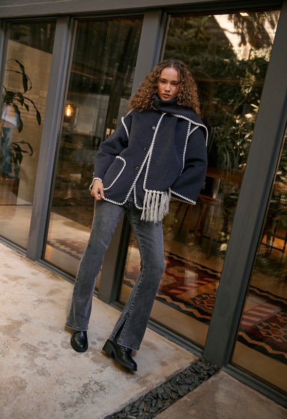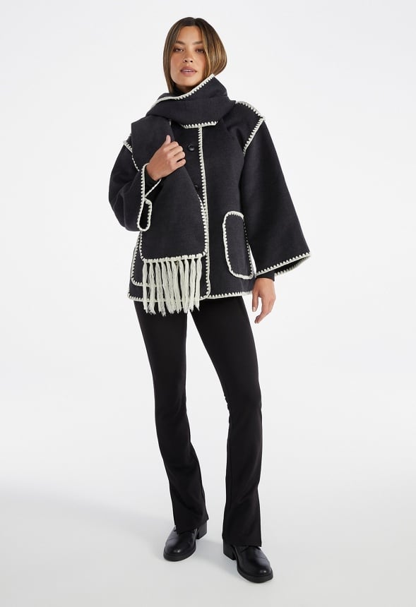 Attached scarf detail Material : 93% Polyester, 5% Viscose, 2% Elastane Length : 29.0 Pockets : Front pockets Closure : Button front closure Care : Machine wash. Please refer to care instruction label inside garment for further details. Imported